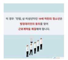 ◆ 최저 연령 만 15세 미만인 자(중학교에 재학 중인 18세 미만인 자 포함)는 근로자로 사용하지 못하며,[14] 이를 위반한 자는 처벌을 받는다.[15]
