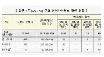 신규 감염자 3062명 중 델타형 변이는 3033명으로, 전체 변이 감염자의 99.1%에 달하였습니다. 나머지 29명은 알파(영국) 변이였다. 베타(남아공) 변이와 감마(브라질) 변이는 나오지 않았습니다.