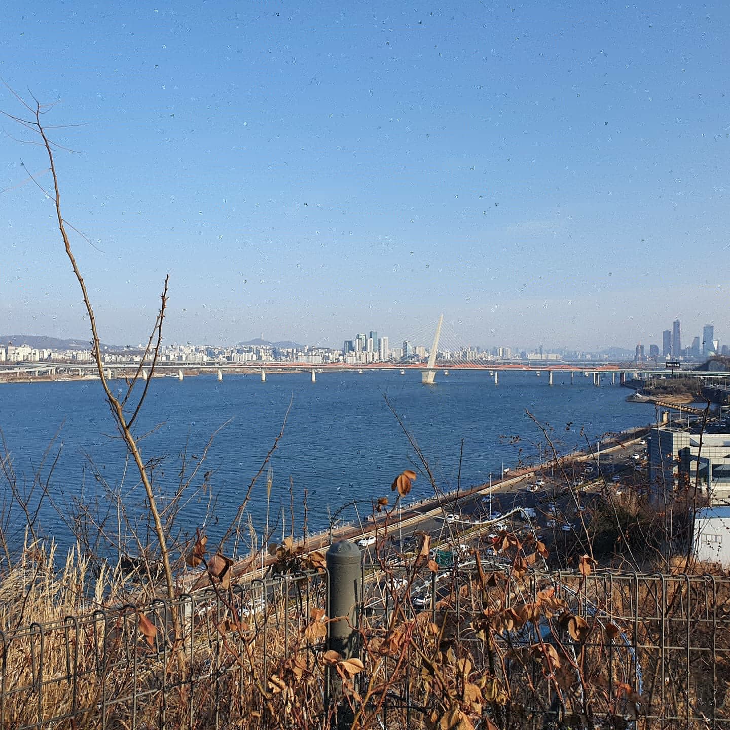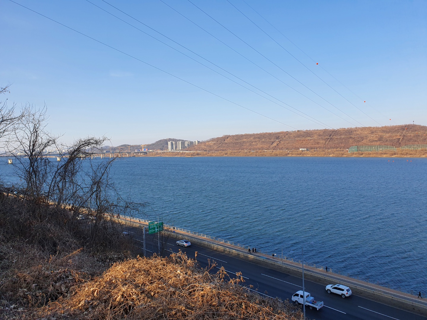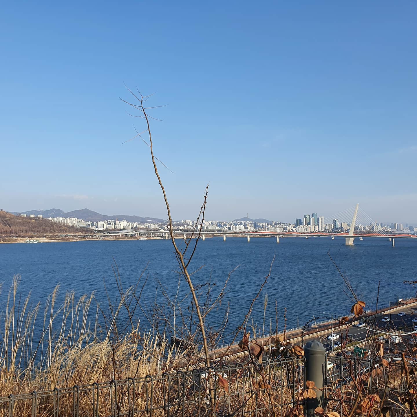 올라가는 길 시작점에 먼지털이가 있다 굉장히 바람이 쎄서 웬만한먼지는 좀 털어낼수 있을듯 ...마침 좀 올라가자마자 88도로를 보게 된다 크 하지만 뒤로보이는 뷰는 한강뷰~!!