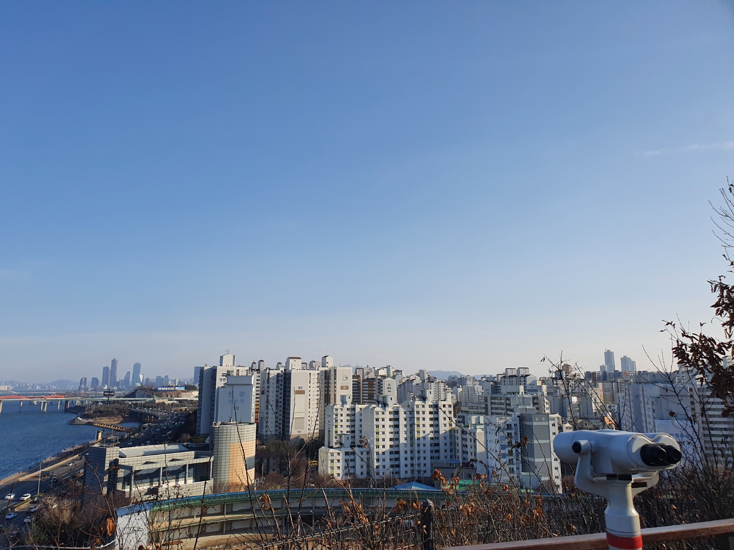 크 드디어 전망에 올라왔다 역시 강서구 혜자동네인지 망원경도 돈 넣지 않고 그냥 볼수 있다 반대편에 있는 곳부터 여의도 전망대가 훤히 보인다 보기 좋다 ㅎㅎㅎ이런뷰에 참 가슴이 뻥 뚫리고 시원해진다 날이 좋아 더 좋았다
